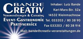 Die Informationen und Angaben der Homepage wurden nach bestem Wissen und Gewissen zusammengestellt. Creativ Veranstaltungen & Catering übernimmt jedoch keine Haftung für die Aktualität, Korrektheit oder Vollständigkeit der bereitgestellten Informationen und Angaben. Alle Angebote sind freibleibend und unverbindlich. Creativ Veranstaltungen & Catering behält es sich ausdrücklich vor, Teile der Seiten oder das gesamte Angebot ohne gesonderte Ankündigung zu verändern, zu ergänzen, zu löschen oder die Veröffentlichung zeitweise oder endgültig einzustellen.